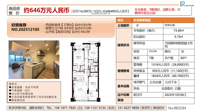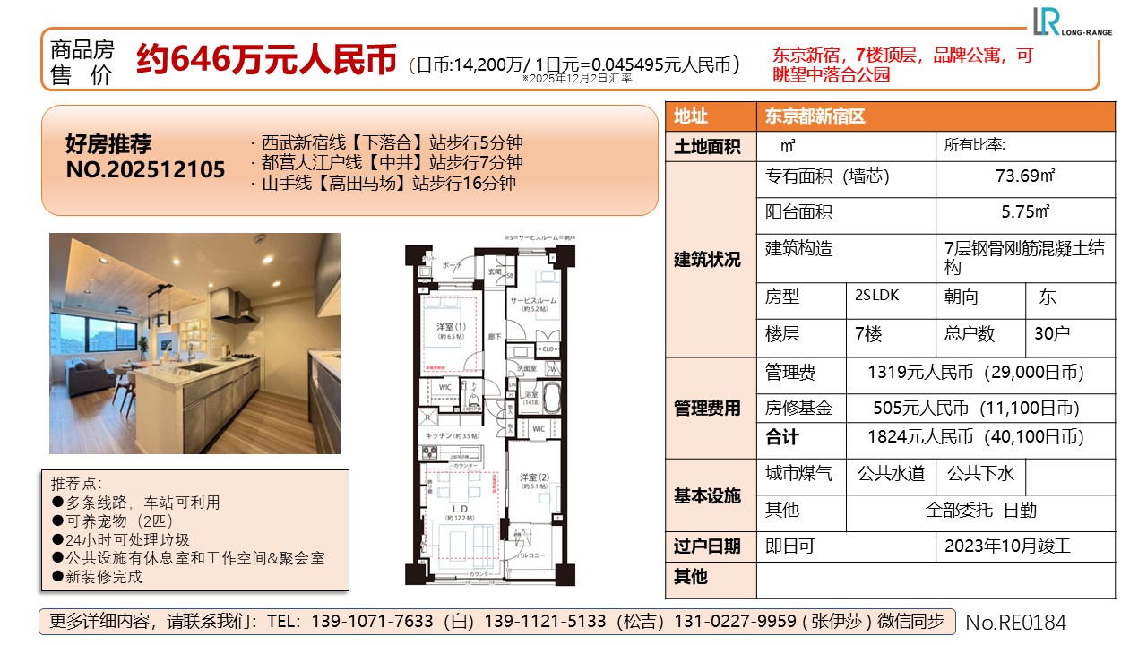 东京新宿,7楼顶层,品牌公寓,可眺望中落合公园 |