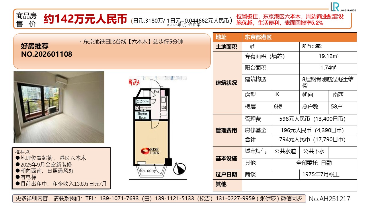 位置极佳,东京港区六本木,周边商业配套设施优越,生活便利,表面回报率5.2% |