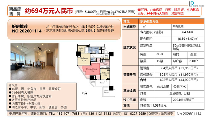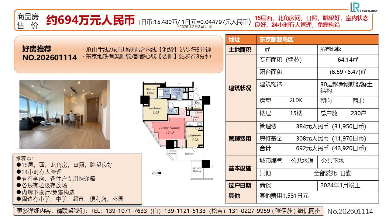 15层西,北角房间,日照,眺望好,室内状态良好,24小时有人管理,免震构造 |